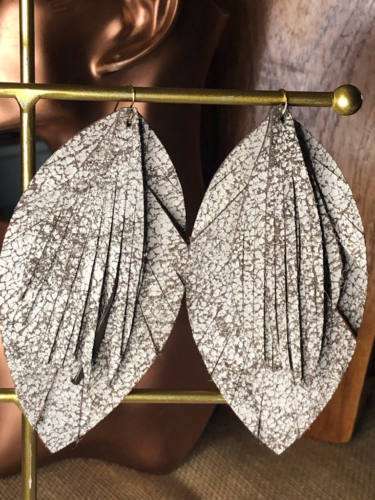 These Cream Crackle Leaves earrings are made from exotic leather, making them both stylish and unique. The 18 karat gold over brass fish hooks add a touch of elegance to the design. At 125 mm in size, they make a bold statement while still being comfortably lightweight. Elevate your accessory game with these one-of-a-kind earrings.