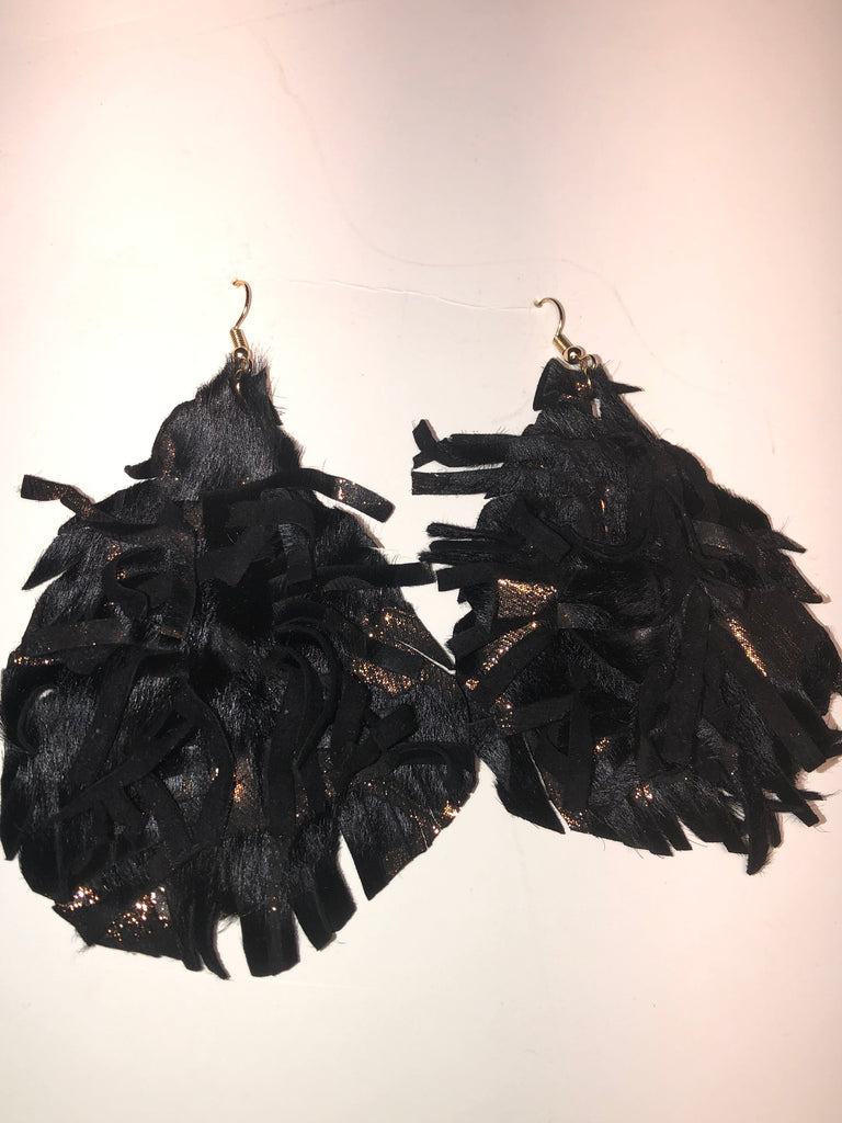 Complete your sophisticated look with Pedals, the must-have oval-shaped earrings. Made with light weight Metallic leather Hair on Hyde and 18k gold over brass hardware, these earrings elevate your style with elegant fringe embellishments. At 3 inches long, they are the perfect accessory for any occasion. Luxurious, exclusive, and adjustable, they are a must-have for the fashion-forward.